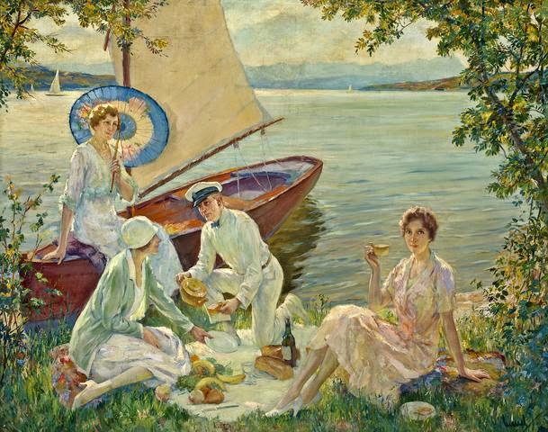 The second source mentions that Cucuel, who mostly portrayed attractive young women, used family members and friends rather than professional models. To judge from his body of work (just Google on his name and then go to Images), his friends must have been dear and the family members very obliging. That's because he did painting after painting showing a pretty woman in white dress, lounging around so that plenty of leg above her white hose was showing and, by the way, part of the top had fallen away to expose a small breast. I show only one of the latter below, the rest indicating other subjects he painted.