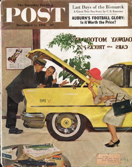 David is in a position to find if there was a policy at the Post for the use of generic cars in illustrations—especially on the covers. I would be very surprised if there was any specific policy in writing. Chances are it was always a verbal reminder from the art director. As you pointed out, it would be extremely poor business for a magazine depending on ads from by several different car manufacturers to feature a specific car on its editorial pages—especially its covers. Enter: the generic automobile.