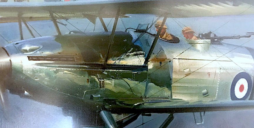 This is a tiny part of a much larger Wootton painting and might be close to actual size when viewed on a desktop computer screen. The aircraft is a Sopwith Camel with metal at the forward part of the fuselage. Note how he shows reflections. Also the effect of light on the gunsight in front of the cockpit windscreen.