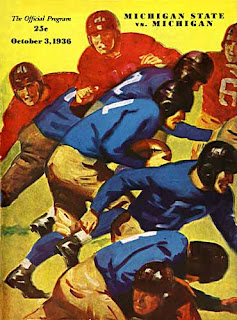 A slight difficulty had to do with the fact that many cover illustrations came from publishers' files and weren't specific to the teams covered in the program. Here, the team in blue does represent Michigan colors, though the helmets aren't decorated in traditional Michigan style. Their opponents are not wearing Michigan State colors.