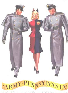 This 1941 Penn-Army program salutes fans rather than the teams themselves. The cadets wear traditional West Point gray -- but what about the girl? She's wearing Penn's Red and Blue and could be a real Penn student because Penn was one Ivy school that admitted women in those days.