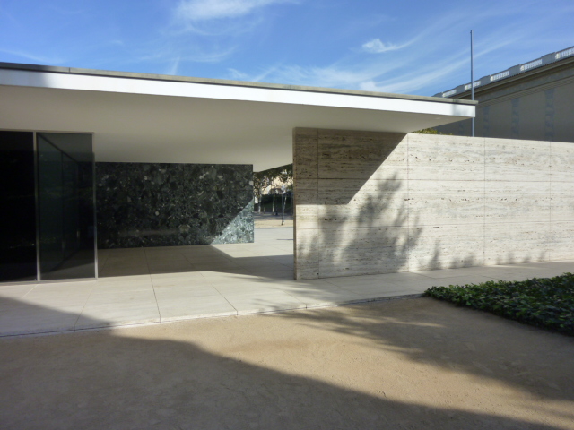 There are gobs, oodles -- whatever term for large numbers -- of photos of Mies van der Rohe's iconic "International Style" German Pavilion built for a 1929 exhibition in Barcelona, destroyed after the event, and rebuilt in the mid-1980s. The Wikipedia entry on the Barcelona Pavilion (its common name) is here and another reference is here.