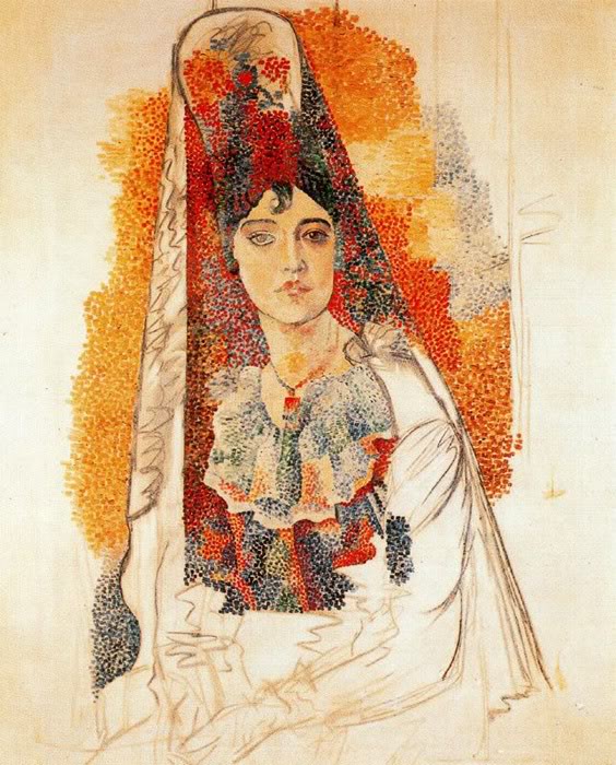 Here Picasso experiments: a smoothly-painted face contrasted with pointillist technique.