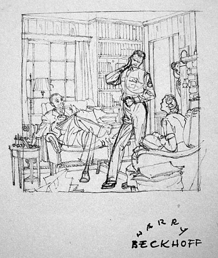 Harry Beckhoff (1901-1979) was an illustrator who worked in thumbnail sketch mode. He didn't make large, sweeping-gesture sketches and then boil them down to production size. Instead, he had his thumbnails enlarged and then traced them as the basis for the final job.
