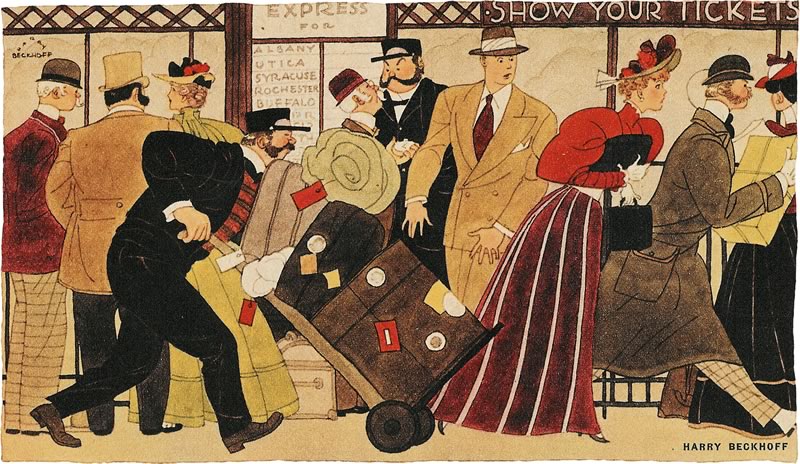 This is a 1950 illustration for a Collier's story titled "The Third Level." It shows New York's Grand Central Terminal with one fellow 40 years out of synch with the other fashions. Might have been an interesting story.