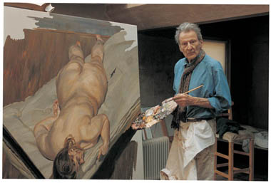 His Wikipedia entry is here and the Telegraph's obituary here, the latter being quite interesting. The image sites in Google and Bing have plenty examples of Freud's work, though perhaps not many of the gamiest of his "spread shots" of male and female nudes; for those, you'll have to go to a bookstore with a good collection in its art section. The top picture above the text shows him at work on an uncharacteristically smooth painting of a nude, the lower shows a 1981 painting of his daughters Bella that provides a view of how he treated skin during his mature period.