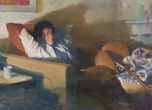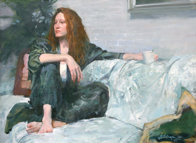 At first, I wondered if he had changed his style. But no, he painted it about ten years ago and what he's done since is typical Silverman. What I think happened was that he allowed the setup surrounding his wife Claire to intrude into the foreground more than he usually does and had to soften it so that it wouldn't distract from her. Further, the interior lighting is somewhat softer than the starker lighting usually found in his interior scenes. The net result was a surprising Silverman (well, surprising to me).