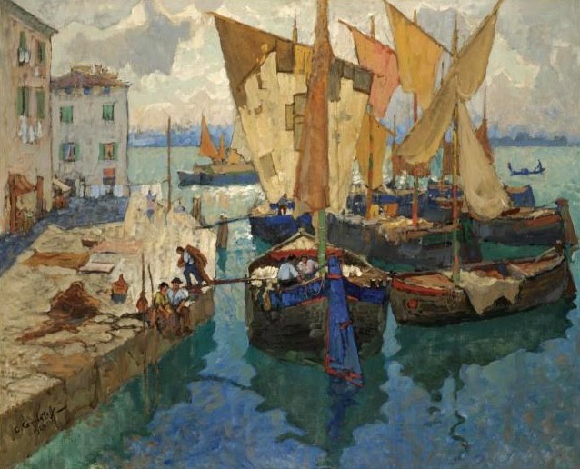 This is a view of sailboats off Chioggia, Italy painted sometime 1922-24 by Edgar Payne, a leading California Impressionist. Compare to Gorbatov's Chioggia and Venice paintings above. Chioggia, by the way, is a small port city at the south end of the Venice lagoon. I've stayed there. It's an unpretentious place with a canal or two. You can travel to Venice from there by boat, but the trip takes a while. You'd probably be better off staying in Venice itself or perhaps a nearby coastal town such as Mestre, a short train ride away if the point of your trip was seeing Venice.
