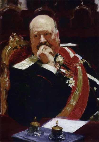 Repin was given extraordinary permission to study council meetings, having insisted that everything be done from life. He worked on the enormous canvas between April 1901 and December 1903 with assistance of two pupils, Boris Kusodiev and Ivan Kulikov. It presented formidable technical problems, not least the perspective of the circular chamber, but also the complexity of arranging scores of figures of varying sizes whilst seeking to retain a harmonious colour scheme amongst a riot of official uniforms and sumptuous furnishings. In the event the Tsar was pushed to the background as Repin was forced to reduce the actual number of members to a more manageable figure.
