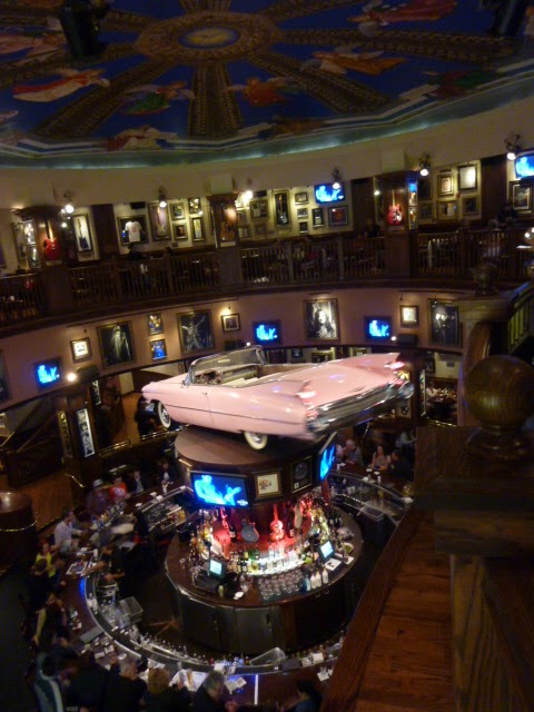 You have to eat someplace. So my wife chose the Hard Rock Cafe, a venue we normally avoid. The most striking thing for me was the pink Cadillac rotating above the bar.