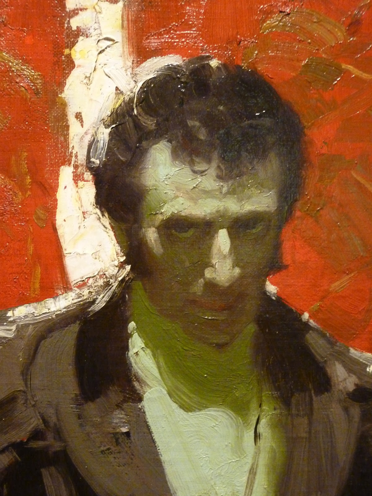 Most artists using bold brushwork and plenty of impasto would paint subjects' faces noticeably more carefully. An example is a Dean Cornwell story illustration featured in another post in this series. But here Schaeffer backed off only a little from his 1920s vigor when he dealt with the count's face. Note the green on the face, shirt and shadow on the shirt, this in contrast to the red background.