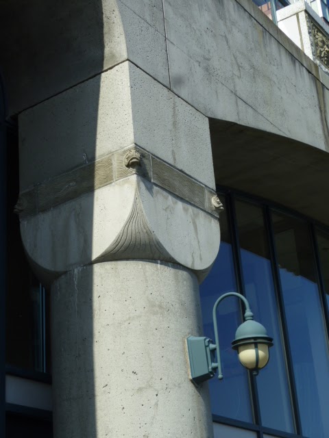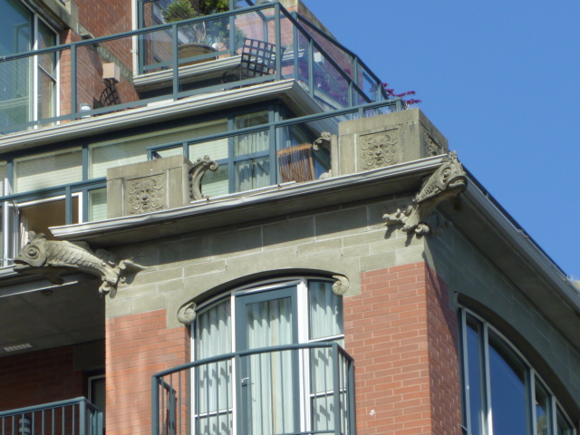 This is the entrance by Dallas Road. There's a definite Art Nouveau feel to it, though the ironwork pattern is geometric (Secession?) rather than organic. I was taken by the sculpted faces.