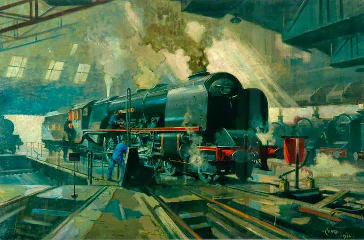No doubt some -- or even many -- readers are train fans. So with that in mind, I'm presenting examples of Cuneo's railway art. Some are simply portraits of famous locomotives, other works deal with various aspects of train travel.