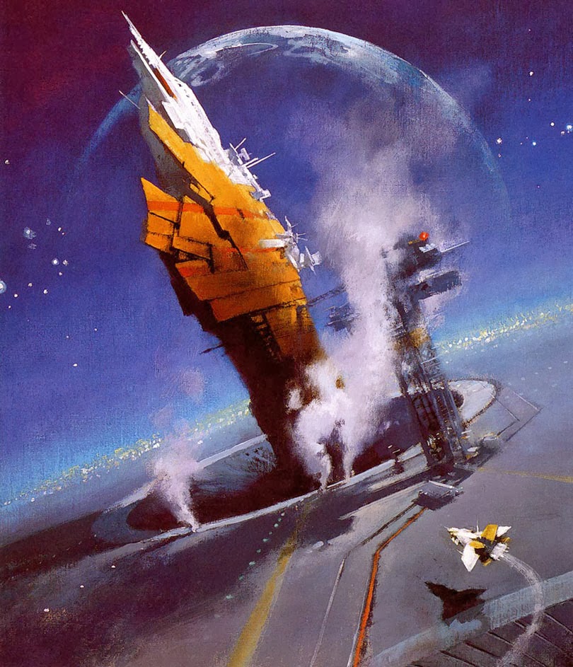 A somewhat older artist than the Muddy Colors crew is British cover artist John Harris (1948 - ), who worked in acrylics and other media for some time, but finally settled on oil paints because he could best achieve desired effects in that way. The best biography of Harris that I could find on the Internet is here.