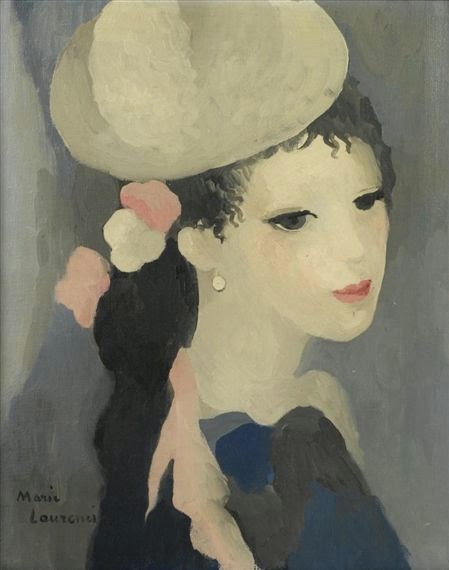 Her early modernist work doesn't seem to have progressed far into Cubism, and by the 1920s she mostly painted "sweet nothings" (as the title of this post indicates) in the form of dark-eyed girls in flat, pastel tones. I suppose Laurencin has her place in the Modernist Art-Historical Timeline, but from what I present below, her pedestal is a short one.