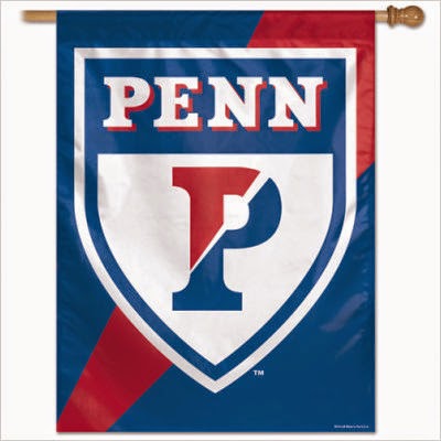 Penn's colors are red and blue. The banner pictured here shows a different set of those colors than the official specification indicates. When I was at Penn, I would see banners, pennants and such with the brighter hues shown above as well as the darker, slightly toned down official shades. To put it roughly, the bright Penn colors are associated with athletic settings (though not on team uniforms) and the darker colors are for clothing, uniforms and most other purposes. This is much like Harvard, where bright, rather "pure" colors aren't for everyday wearing, especially by 20th and 21st century American males.
