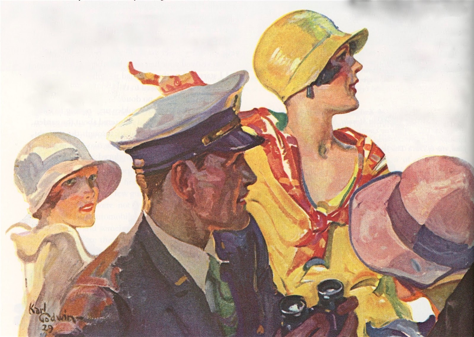 Since then, I've made new scans of details of advertisements for Hudson cars and located images of one complete ad along with two others in the series. They are shown below along with other Godwin illustrations, some of which were in the posts noted above. Click on them to enlarge.