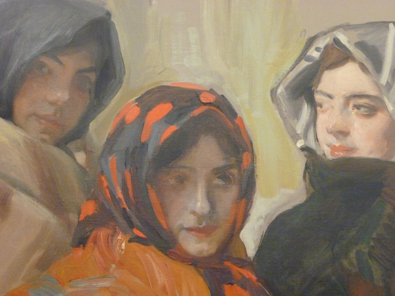 What is rare are clearly unfinished paintings. Fortunately, the museum has an example of a study made as part of his Regions of Spain commission. Part of the work is "complete" (insofar as Sorolla "finished" his later works). Other parts reveal preliminary on-canvas oil sketching of a person.