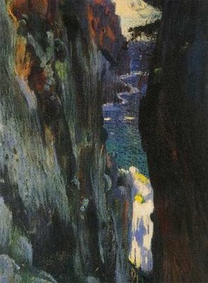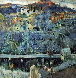 Joaquim Mir (1873-1940) was a Catlonian painter who specialized in landscapes -- landscape paintings that caught my eye in more than one Spanish art museum in October. Unfortunately, I could find little about him in English on the Internet. The most comprehensive item was here, and it's in Catalan! If you know any Spanish or Italian, you might be able to get the gist.